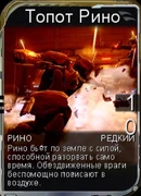 Топот Рино -Рино бьёт по земле с силой способной разорвать само время. Обездвиженные враги беспомощно повисают в воздухе Требует энергии - 100 Характеристики при макс прокачке: Стоимость установки - 13 Радиус, м - 20 Длительность, с - 9 Урон - 800 Примечания: Противники в пределах радиуса действия поднимаются в беспомощном состоянии в воздух и затем бьются об землю с минимальным уроном Урон способности можно увеличить с модификатором Фокусировка Радиус действия может быть увеличен модификатором Растяжение Воздействует на врага через стены, двери, а также над и под Рино Может быть активирована только на земле Довольно эффектная и эффективная способность, обездвиживающая в большом радиусе серьёзных противников и беспощадно уничтожающая более слабых (примерно до 30-го уровня)