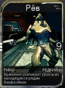 Рёв-Временно увеличивает урон всех находящихся рядом Варфреймов. Требует энергии - 75 Характеристики при макс прокачке: Стоимость установки - 9 Увеличение - 50% Примечания: Длительность способности можно увеличить с помощью Продолжительности и Телосложениe (Проверено) Увеличить урон способности можно с помощью Фокусировки (Проверено) Влияние рыка на остальные способности проверяется Очень эффективная способность, позволяющая отряду быстро и без потерь вывести из строя практически любого противника (включая боссов)