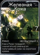 Железная кожа - Кожа Рино твердеет, получаемый урон идет сначало по коже потом по щитам и жизням Рино Требует энергии - 50 Характеристики при макс прокачке: Стоимость установки- 7 Предел урона- 1200 Примечания: Максимальное количество урона, поглощаемого способностью может быть увеличено модификатором Фокусировка В течении действия способности Рино неуязвим, пока не будет достигнут предел полученного урона Защищает от контроля, яда, оцепенения и выкачивания энергии Может быть активирована из любого положения варфрейма Может быть использована как для блокировки лазерных барьеров, так и для их безопасного прохождения