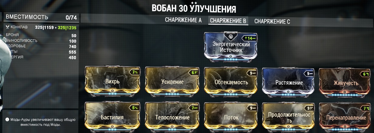 Моды: Аура – Энергетический источник (+0,6 к регенерации энергии, складывается если в группе есть еще люди с такой аурой) Слот 1– Вихрь 3/3 (основная способность) Слот 2 – Усиление (+30 к силе способности (количество удерживаемых врагов)) Слот 3 – Обтекаемость 5/5 (+30% энергоэффективности) Слот 4 – Растяжение 5/5 (+45% к зоне поражения способности) Слот 5 (форма) – Живучесть 10/10 (+440% к Здоровью) Слот 6 – Бастилия 3/3 (обычно начинаю использовать на 40+ волне) Слот 7 – Телосложение 3/3 (+40% Быстрый подъем на ноги, +28% к длительности способности) Слот 8 – Поток 5/5 (+150 к энергии) Слот 9 – Продолжительность 5/5 (+30% к длительности способности) Слот 10 (форма) – Перенаправление 10/10 (+440% к щиту)