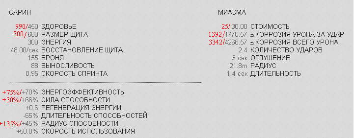 Сарина загрязняет атмосферу ядовитыми испарениями, разлагающими всех врагов в зоне поражения, а также мгновенно расщепляющими любую органическую и синтетическую материи.